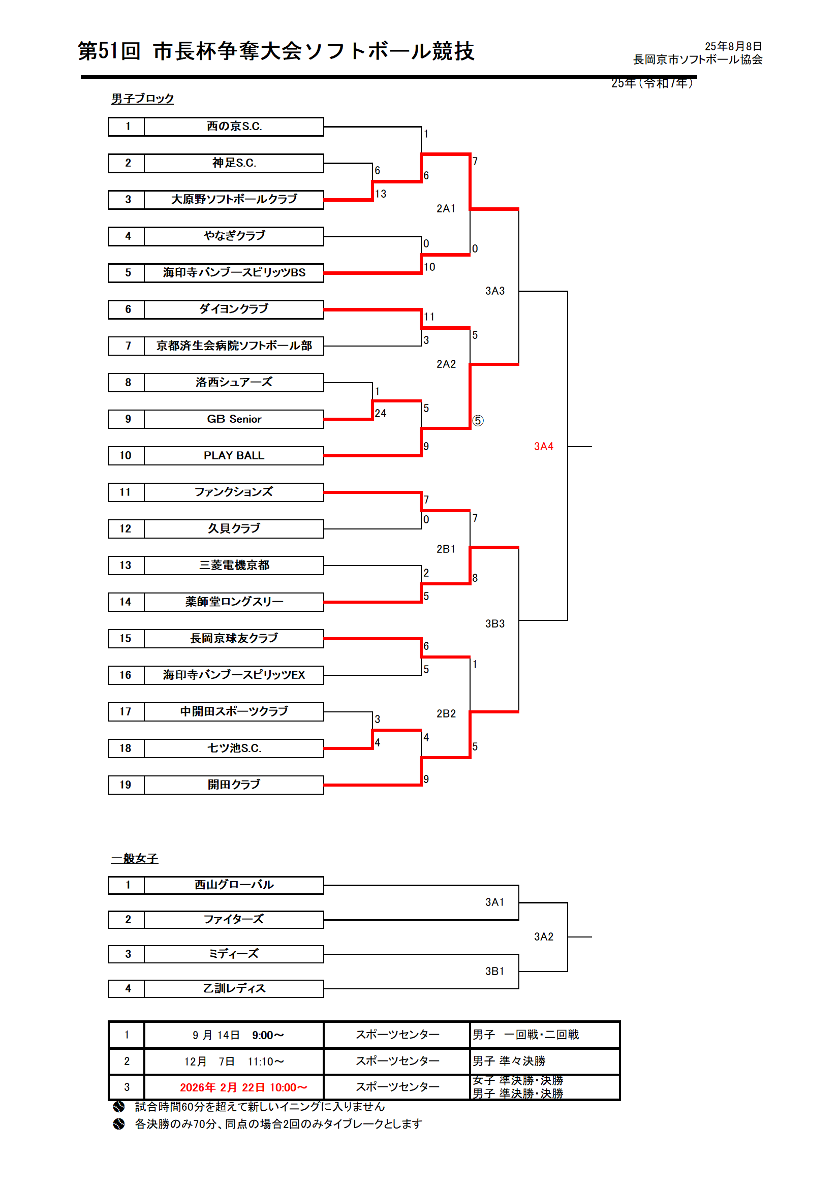 会長杯リーグ戦の予定変更に伴い「第51回市長杯争奪大会」の2日目は、12月7日(日) 11:10~ 実施予定となりました。